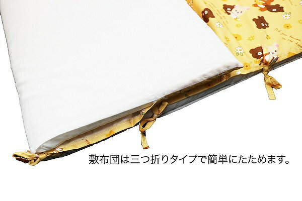 素材、掛布団カバー、表地ポリエステル100% 裏地ポリエステル80%・綿20% 掛布団側地・中綿/ポリエステル100% 敷き布団カバー表地ポリエステル100%、ポリエステル80%・綿20% 敷き布団側地・中綿ポリエステル100%、 枕側地・中綿:ポリエステル100% 枕カバーポリエステル100%キャリーバッグ表地:ポリエステル100% 裏地・中綿:ポリエステル100%。